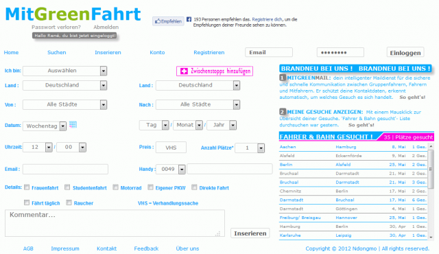 Anmerkung vom 24.06.: Der Anbieter hat sich einen zweiten Namen zugelegt: mitfahren.de. Identisches Portal, identische Einträge. Namen sind bekanntlich Schall und Rauch.