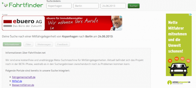 die beste Aufstellung, die in Deutschland über kostenlose Mitfahrportale und Metasuchmaschinen existiert! Kompliment!