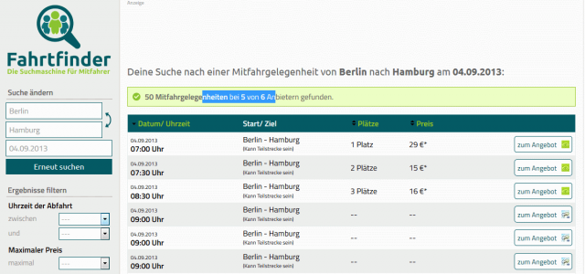 Update: 11.12.13: Fahrgemeinschaft ist nun auch Suchmaschine und listet Ergebnisse anderer Anbieter.