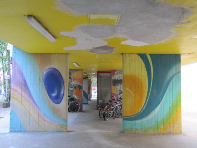 Vielen Dank auf Jens, der das Rätsel mit den bunten Wänden auflöste. Dieses Gebäude ist am Mehringplatz in der Ecke Franz-Klühs-Straße/Wilhelmstraße. Das Indiz war das Parkhaus daneben.