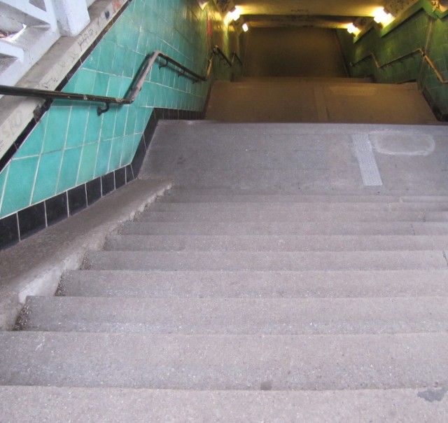Wenn ich als verhältnismäßig junger Mensch am Eingangsportal des Tunnels stehe und die 50 Stufen hinabblicke, so habe ich durchaus Respekt vor dem Gefälle! Der Höhenunterschied beträgt ca. 10 Meter: