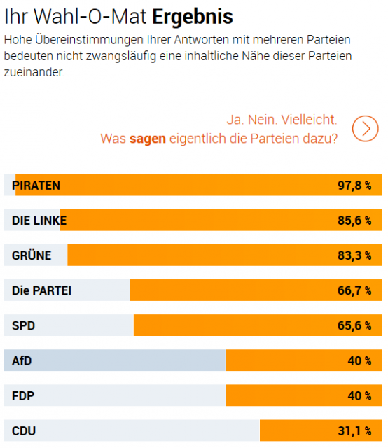 In Baden-Württemberg, Rheinland-Pfalz und Sachsen-Anhalt finden Mitte März Landtagswahl statt. Dazu gibt es wieder einen wahl-o-mat, den ich durchgeführt habe.