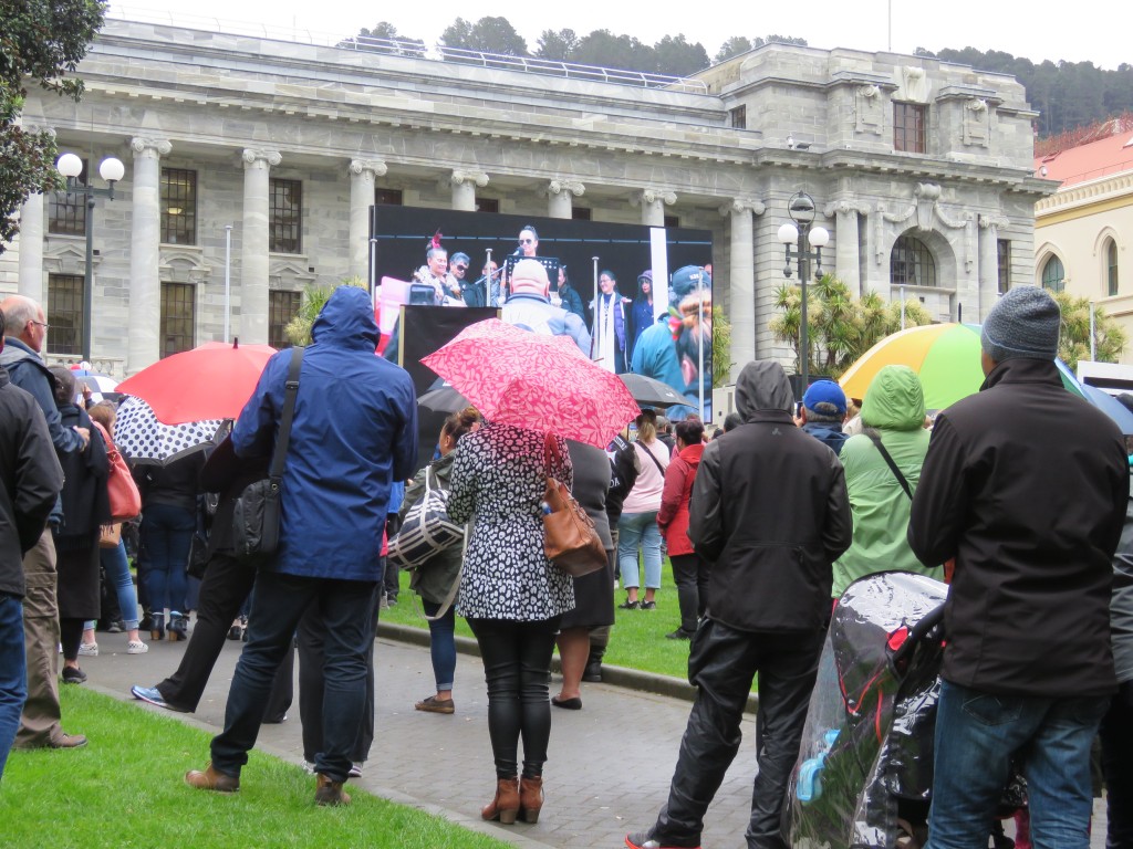 Dann ging es zur Fähre. Bekanntermaßen soll man ja etwas eher da sein. Wir befahren das Areal der Fähre – und erfuhren, dass die Fähre Verpätung hat. Kein Problem, dachten wir, so können wir noch einige Schritte laufen. Und so sahen wir den Bahnhof von Wellington, der durchaus noch sehr charmant wirkte. Und zum Abschluss noch das Beehive. Das ist der Spitzname des neuseeländisches Parlaments, da es wie ein Bienenstock aussehen soll. Dort war gerade Trubel angesagt, viele Demonstranten.