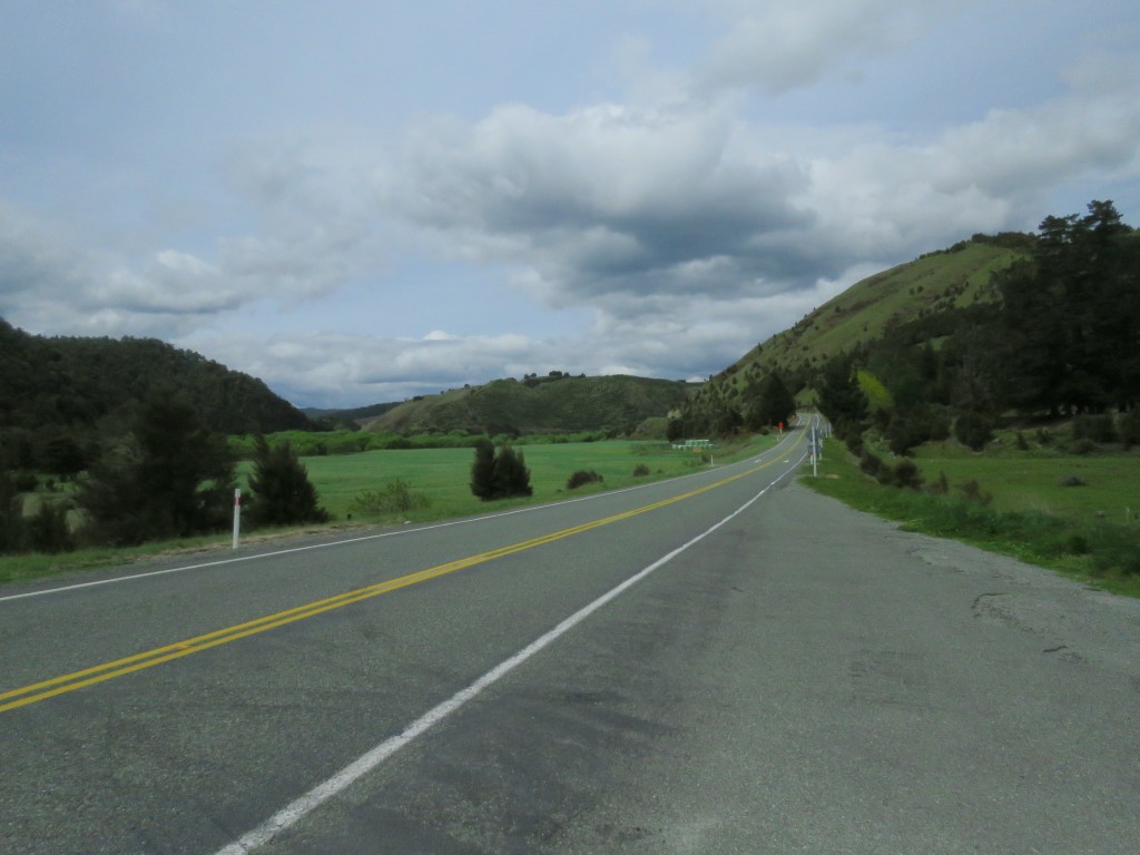 Wir fuhren entlang des State Highways 63, der ziemlich kerzengerade entlang des Flusslaufes des Wairau River führt. Nach gut 50 Kilometern passierten wir den Wye-River. Sofern man es Fluss nennen kann: das Flussbett war trocken. Es führte eine einspure Brücke („One Lane Bridge”) hinüber. Und genau daneben ging noch eine Spur durch den Fluss.