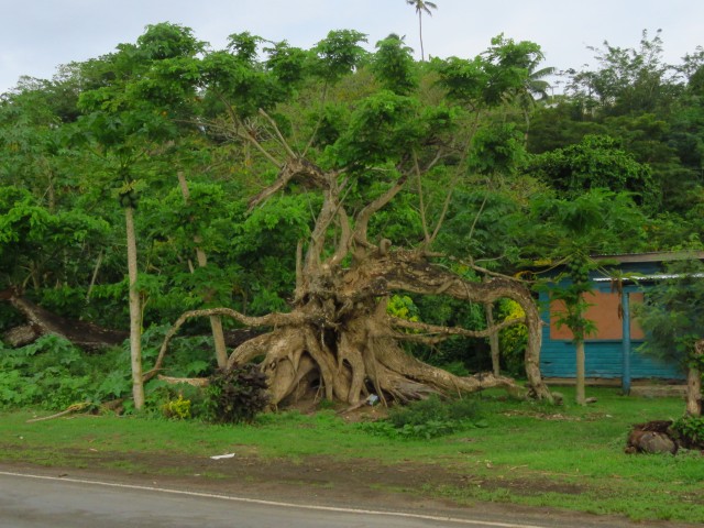 Zunächst entlang der Straße ging es bis ins nächste Dorf Tavuki. Dieser Baum ist für sich schon eine kleine Sehenswürdigkeit: