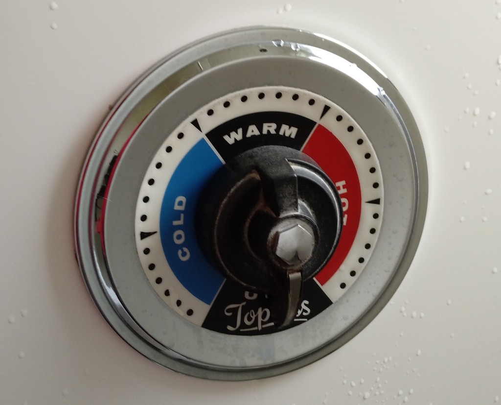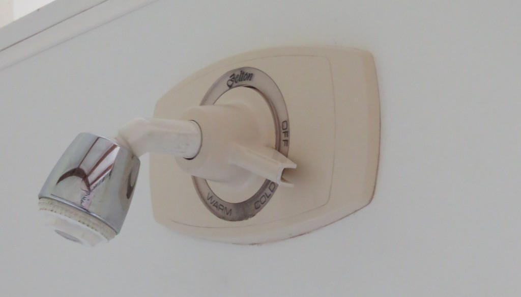 Die Duschen in Neuseeland waren meistens auch etwas sonderbar gewesen, wie zum Beispiel auch in diesem Cottage. Es gibt nur einen Hebel: Von Aus über Kalt bis Heiß. Es wird also immer erst mal kalt – und du kannst die Wassermenge nicht regulieren.