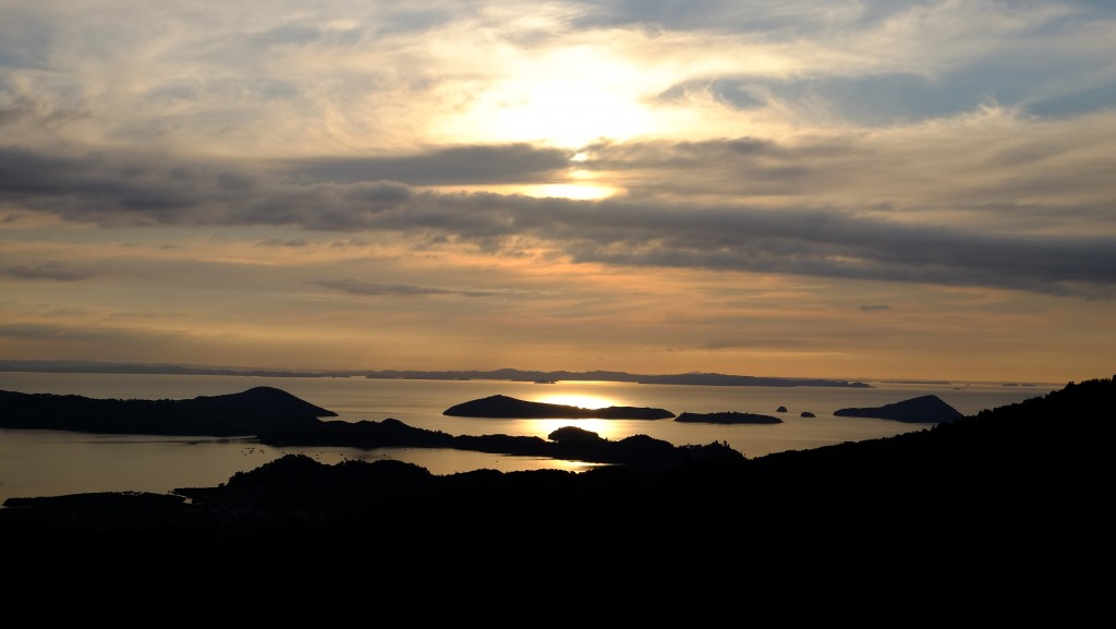 Wir hatten sehe schöne Sonnenuntergänge in Coromandel. Hier zum Beispiel vom Whangapoua Road Scenec Lookout, eine steile Erhebung entlang des State Highway 25 hinter Coromandel Town – mit Blick auf den Ort und die Bucht: