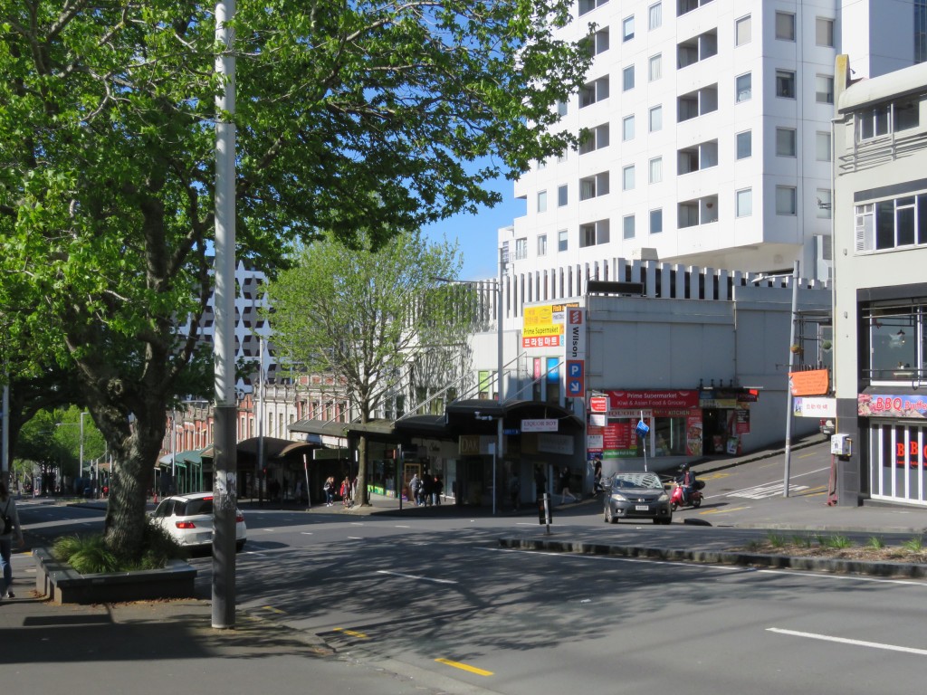Also löhnten wir – und stiegen ein. Der Bus fuhr über die Dominion Road. Das ist eine lange Magistrale im Süden Aucklands (und hat nix mit dem gleichnamigen Spiel zu tun). Wir sahen anfangs fast nur einstöckige Gebäude. Die wenigsten der einzeln stehenden Gebäude hatten ein Obergeschoss. Das wunderte uns schon, zumal wir in Neuseelands größter Stadt irgendwo zwischen Innenstadt und Flughafen waren. Andererseits: in Auckland wohnen ungefähr halb so viele Menschen wie in Berlin auf einer Fläche, die sechs Mal so groß ist wie Berlin.