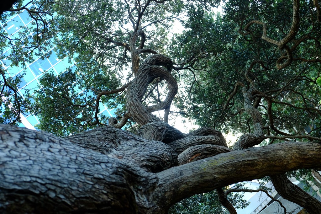 Der Emily Place Reserve ist ein kleiner dreieckiger Platz nur wenige Straßenzüge vom Bahnhof entfernt – und auf halber Höhe zum Albert Park. In diesem kleinen Park stehen eigentlich nur vier Bäume, die extrem ausladend sind. Das sind Pohutukawa (Neuseeländischer Weihnachtsbaum):