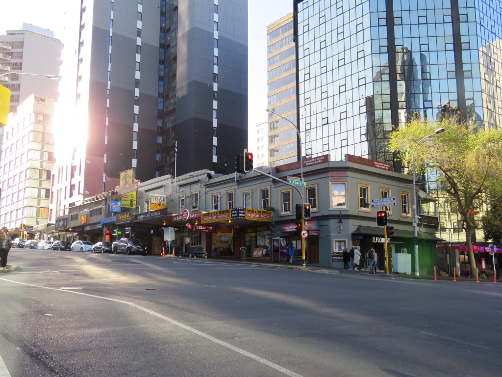 Erst kurz vor dem Stadtzentrum wurde es höher. Und als wir die Queens Street erreichten, blickten wir auf ein Tal mit zahlreichen Wolkenkratzern. Wir lernten die drei Buchstaben CBD kennen, Central Business District. Zu gut Deutsch: Stadtzentrum.