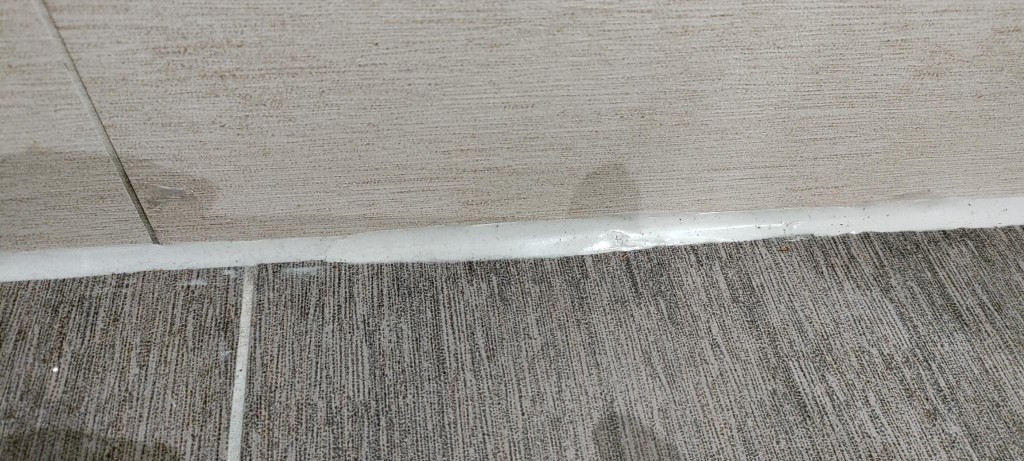 Zwischenzeitlich trat der eine gegen die frische Silikonzeile am Duschwannenrand. Deren Ausbesserung sieht nun in etwa so aus, wie ich es wohl auch alleine geschafft hätte: wulstig.