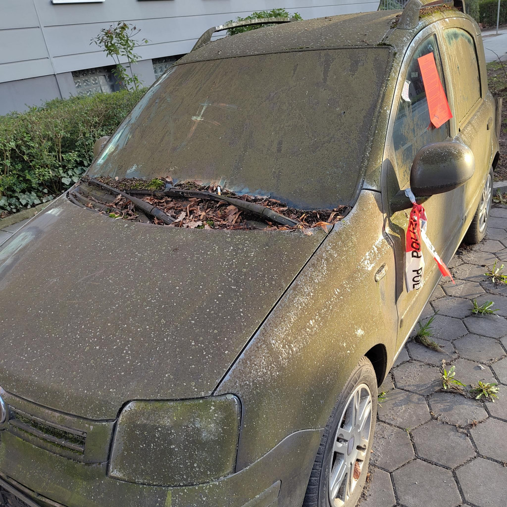 Die Windschutzscheibe ist blind vor Schmutz, der Motorraum vollgestopft mit Laub, die Karosserie von einem grünen Film überzogen, als wäre das Fahrzeug Teil eines Kunstprojekts zum Thema „Urbaner Verfall“. Doch es ist kein Kunstwerk. Es ist einfach nur verlassen.