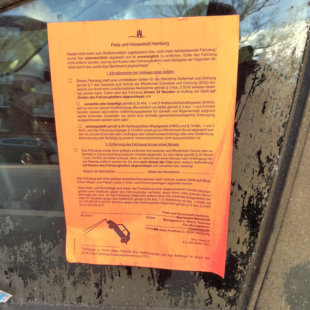 Es hängt ein warnend orangener Zettel an der Scheibe der Fahrertür. Eine „Verfügung“, ausgestellt vom Bezirksamt Wandsbek – das hier allerdings gar nicht zuständig ist. Und als wäre das nicht schon grotesk genug, fehlt auf dieser Verfügung sogar die Frist, bis zu der das Auto zu beseitigen ist. Doch so eine Anordnung ohne Datum ist leider nichts wert.