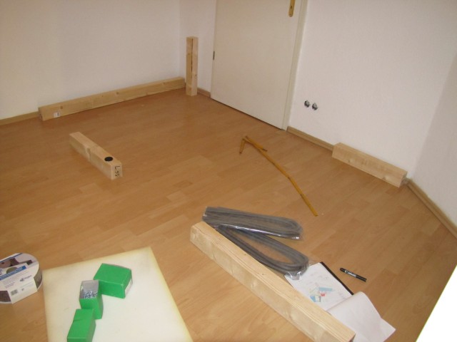 - die Pfosten dürfen nicht direkt auf das Lamimnat errichtet werden – zur Lastverteilung sollte stets ein Balken quer liegen (das war eine sehr gute Idee!)