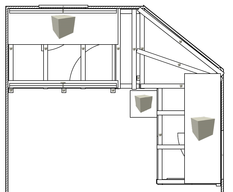 - Sofern gewünscht, könnten die Bereiche zwischen den Fallschulzbalken mit einem Regal erweitert werden.