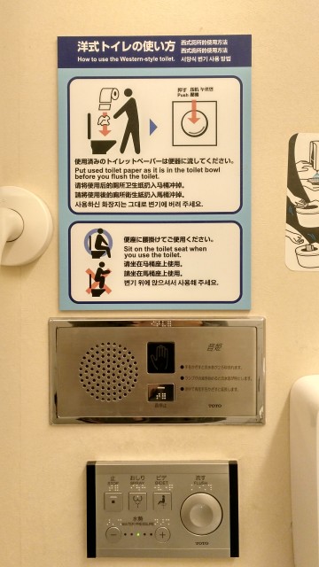 Der Mythos um die japanischen High-Tech-Toiletten begleitete auch unsere Reise. Der Nervenkitzel, ob man auch den Flush-Button (Spülung) finden wird[1]. Tatsächlich fragten wir uns schon, warum es dieser Toilettentyp eigentlich nie aus Japan heraus geschafft hat?