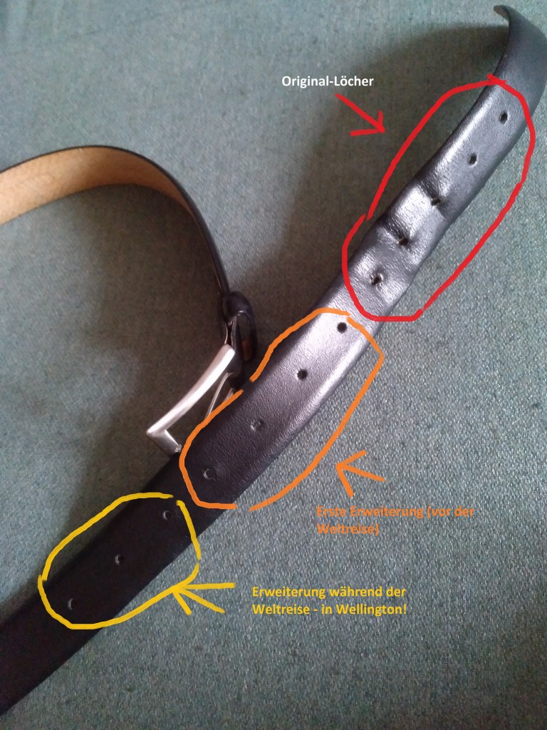 Zum Gewicht hatte ich oben schon zwei Stories (Fahrstuhl, Geburtstag). Auf Fiji hatte ich noch eine Hose aus alten Tagen an, die praktisch nur der Gürtel in Position hielt. Nun piepte der Scanner beim Inland-Flug. Und ich musste zu verstehen geben, dass ich bei ausgezogenen Gürtel nicht beide Hände in die Höhe halten konnte.