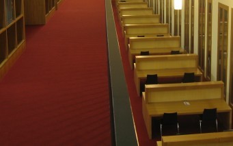 • Die neue Bibliothek bietet weitaus mehr Platz, was sich durch zahlreiche Sitzgelegenheiten bei den Regalen und an den Gängen bemerkbar macht. Durch diese Geräumigkeit wirkt der Buchbestand allerdings eher gering im Verhältnis zur Gebäudegröße.