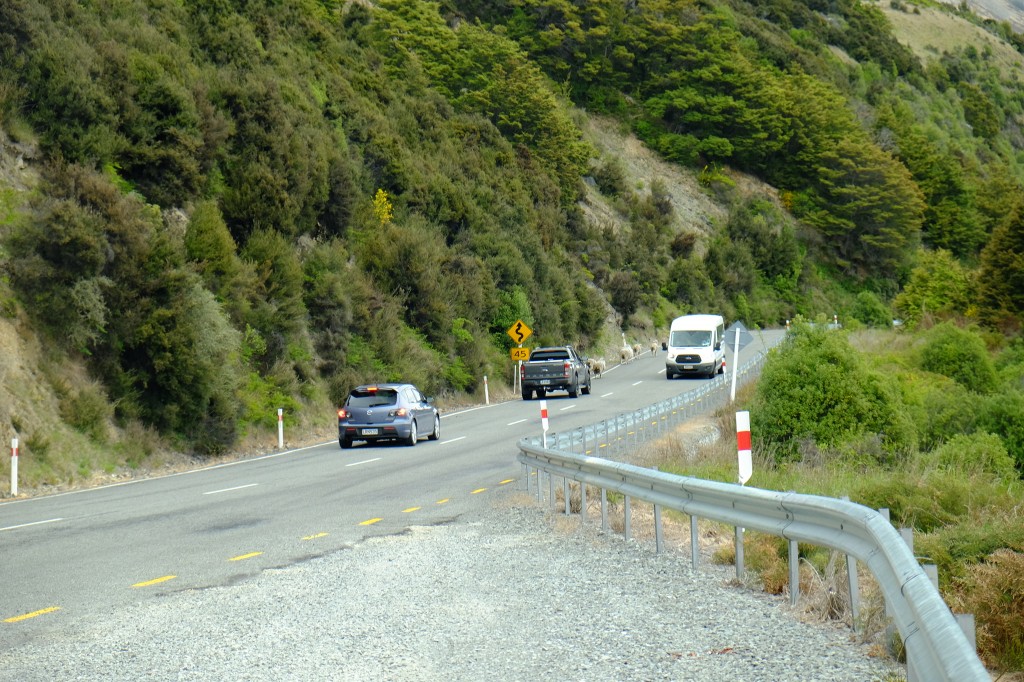 NZ: State Highway 73 (Waimakariri River - Schafe auf Fahrbahn)