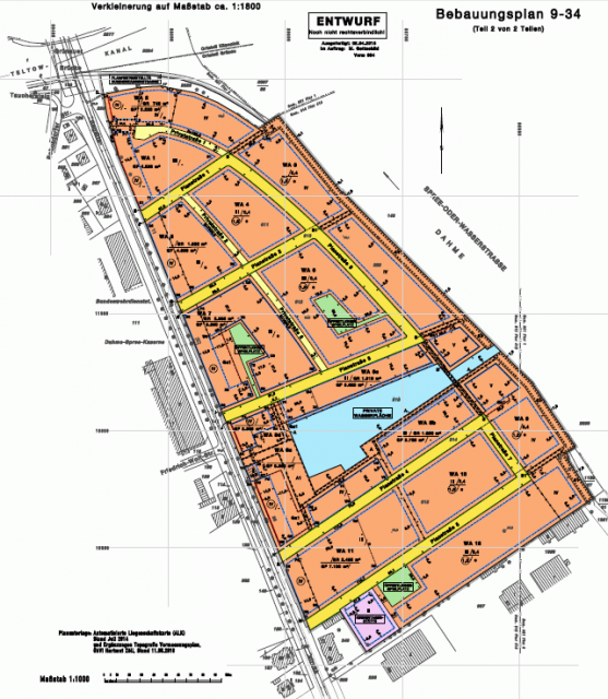 In der Mitte des Areals ist eine Wasserfläche geplant. Entgegen der ursprünglichen Idee allerdings ohne Öffnung zur Dahme, somit ist es ein geschlossenes Wasserbecken.