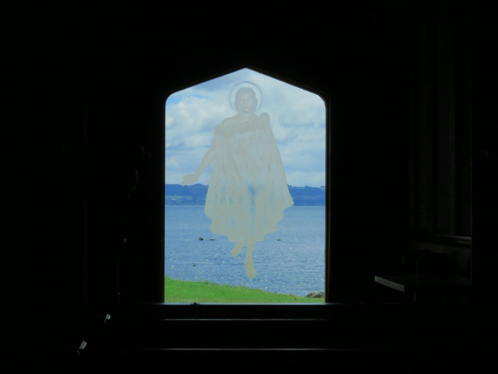 Die Schnitzereien an den Holzbänken und Säulen zeigen typische Motive der Maoris. Das Highlight der Kirche war ein großes Fenster zum See, in dem ihre angebetete imaginäre Person wie über Wasser laufen soll.