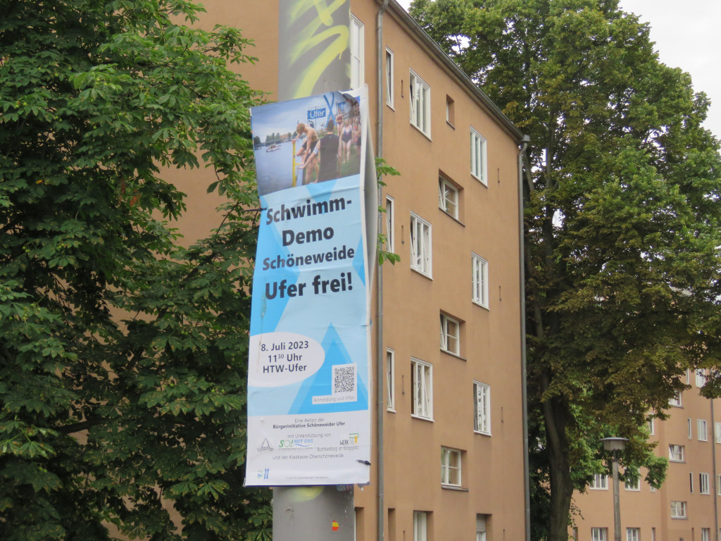 Ist denn das Spreeufer zwischen Kaisersteg und HTW inzwischen frei passierbar? Damit beschäftigte man sich schon vor meiner Legislatur, das beschäftigte mich natürlich auch. Die Antwort fand ich bereits am Brückenkopf: es wird zu einer Schwimmdemo aufgerufen.