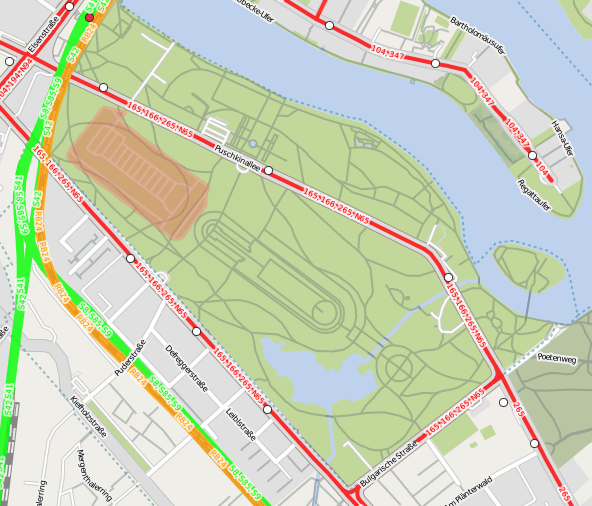 Ich habe das Gelände des Zentralen Festplatzes auf die Große Liegewiese im Treptower Park projiziert (gleicher Maßstab, nur etwas gedreht)