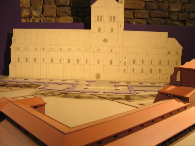 Rückblick: Römerbau (rot), ursprünglicher Bau (weiß), heute (blau)