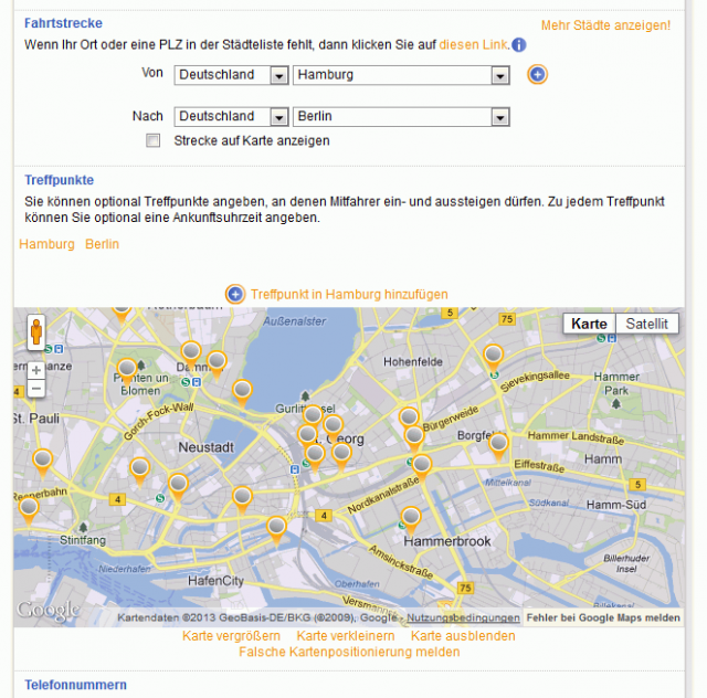 Das Einstellen der Fahrt ist übersichtlich. Zwischenhalte sind nicht möglich. Fahrten kopieren geht ebenso nicht. Ist die Anzeige einstellt, darf man sich über ID-Nummer freuen, die aus drei Buchstaben und acht Ziffern besteht. Leute mit guten Zahlengedächtnis können anhand dieser Nummer ihre Mitfahrgelegenheit auch wieder identifizieren. Es gibt Google-Karten, aber da scheint die API Fehlermeldungen zu werfen.
