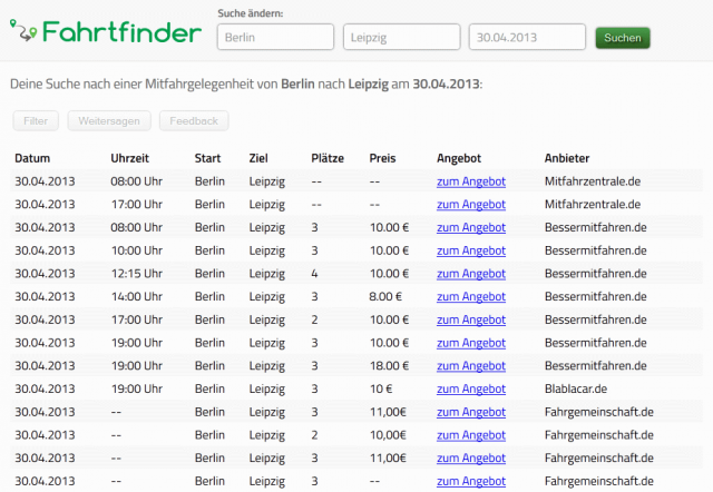die beste Aufstellung, die in Deutschland über kostenlose Mitfahrportale und Metasuchmaschinen existiert! Kompliment!