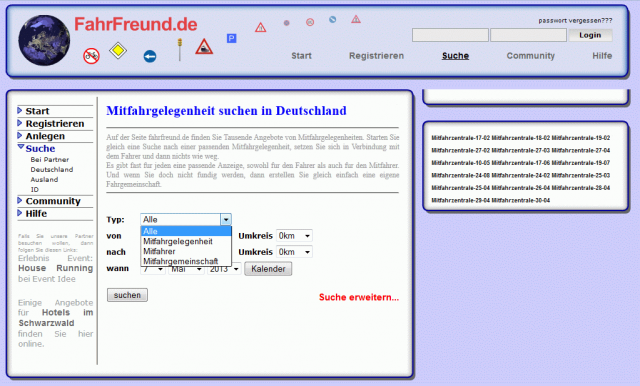 Die Suchfunktion dürfte den gewöhnlichen Sucher hoffnungsvoll überfordern. Es kann zwischen einer “Mitfahrgelegenheit”, “Mitfahrer” und einer “Mitfahrgemeinschaft” gesucht werden. Liest man sich den Text überhalb des Formulares durch, wird man noch verwirrter. Das nächste Kuriosum sind die zahlreichen Links auf der rechten Seite. Ich rätsel immer noch, was sie mir sagen sollen. Auf jeden Fall kann ich nach irgendwelchen Fahrten zu bestimmten Terminen von 2012 suchen.