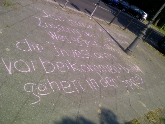Es ist nicht das erste Mal, dass auf der Fläche links vor dem Eingang zum Treptower Rathaus Botschaften mit Kreide geschrieben sind. So ging es im Juni um die Versteigerung der Erbbaupacht des Spreepark-Areals, die am 3. Juli bevorsteht.