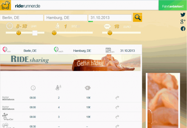 Viel brauche ich zu Mitfahrsuche nicht zu sagen. Im Grunde ähnelt sich der Ansatz zu Fahrtfinder. Über eine Maske auf der Startseite wird Start- und Zielort sowie Datum angegeben. In den Details kann nach Uhrzeit, Preis und Sitzplätze gefiltert werden. Und das Portal recherchiert auf einer Vielzahl von Plattformen.