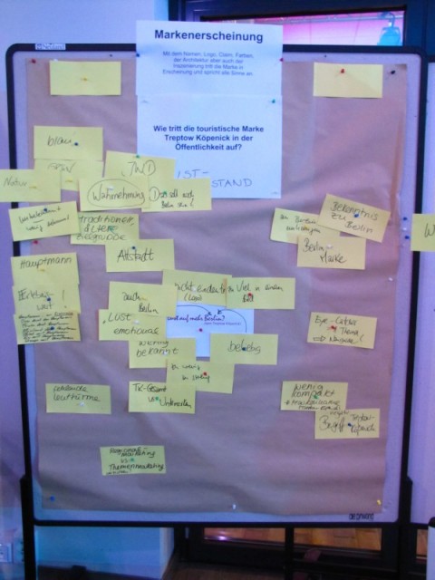 04Nov. 201307 - Wie tritt die touristische Marke Treptow-Köpenick in der Öffentlichkeit aufBild: Ergebnisse des Workshops Marke der Destination TK zurück zur Galerie »Ergebnisse des Workshops Marke der Destination TK«Bisherige Kommentare (0)Es wurde noch kein Kommentar geschrieben!Kommentar verfassen Name: E-Mail: Freiwillige Angabe Homepage: Freiwillige Angabe Kommentar: Der Text kann mit Textile formatiert werden, z.B. *fett* _kursiv_ "link":url. Wie das geht? Spamschutz:: Wieviel ist 40 plus 2? Bisherige Trackbacks (0)Es wurde noch kein Trackback empfangen!