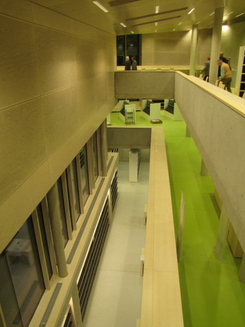 Der neue Gebäudeteil erstreckt sich über drei Etagen, davon eine im Kellergeschoss. Entlang der Kante zum Innenhof ist die Bibliothek über alle Stockwerke offen. In diesem Bereich sind auch jeweils Arbeitsplätze installiert. Im Obergeschoss gibt es eine gemütliche Sitzecke mit direkten Ausblick auf die gegenüberliegenden Tankstellen. Bei den kleinen Fenstern an der Gebäuderückseite gibt es Sitzplatznischen. Die Fußböden sind in den oberen Geschossen hellgrün, die Wände verkleidet, die Säulen und Decken überwiegend aus unschönen Sichtbeton.