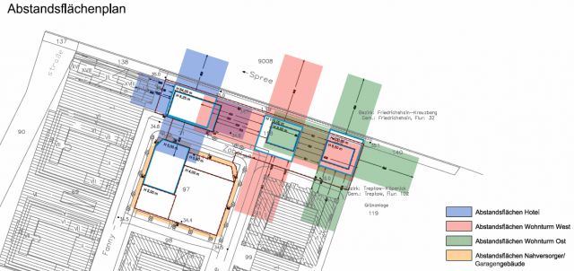 Knackpunkt ist dabei weniger der Schattenwurf (der bedingt durch die Lage größtenteils in die Spree fällt), als viel mehr das Licht, was in den Wohnungen der unteren Stockwerke eintrifft.