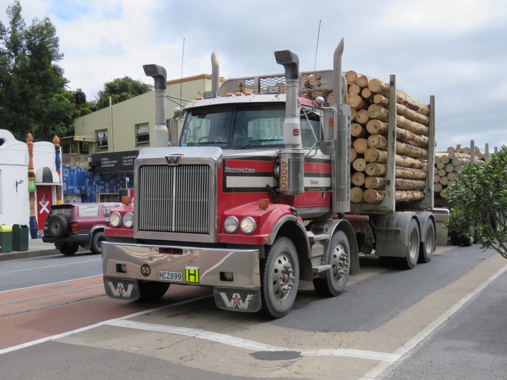 Kawakawa ist einer der Orte, den vermutlich niemand bewusst ansteuern würde. Der State Highway 1 führt direkt durch die Hauptstraße des Ortes. In der Mitte der Straße liegen noch Gleise einer alten Eisenbahnstraße, die mal für den Kohleabbau wichtig war. Heute fahren da viele LKWs mit ausladender Schnauze Baumstämme durch die Gegend.