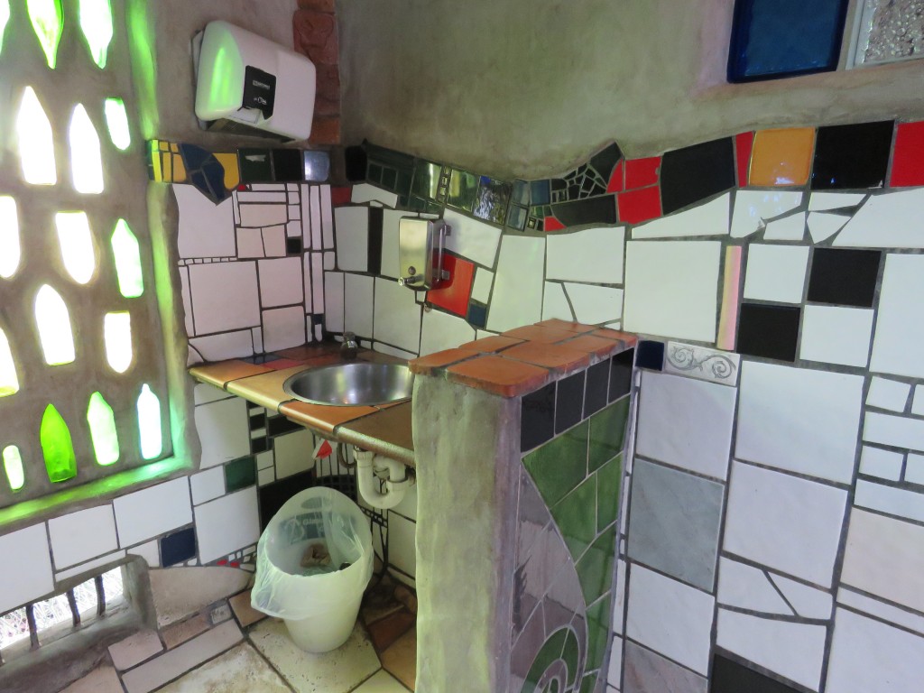 Und doch kommt man als Tourist nicht darum, hier zu halten. Denn hier in der Nähe wohnte Hundertwasser die letzten 27 Jahre seines Lebens und das letzte Bauwerk, was zu seinem Lebzeiten 1999 eröffnete, steht im Zentrum dieses Ortes: es ist eine Bedürfnisanstalt. Ja, eine Toilette. Es soll, Gerüchten zu folge, die am häufigsten fotografierte Toilette der Welt sein. Keine Ahnung, aber wenn man bedenkt, wie häufig man sonst Toiletten fotografiert, dürfte das wohl hinkommen.