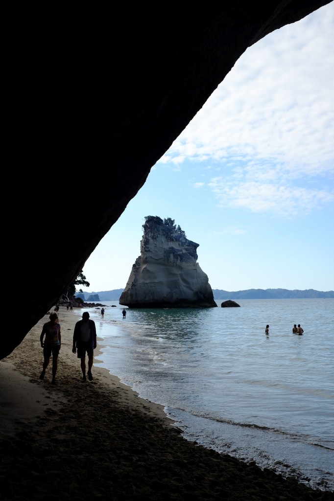 Durch die Cathedral Cove kommt man nur bei Ebbe trockenen Fusses. Während wir am Strand verweilten, kam die Flut zurück. Gerade noch rechtzeitig passierten wir den Durchgang.