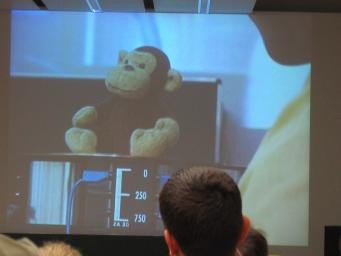Die Spule erzeugt ein Magnetfeld, die die Scheibe, auf die der Affe sitzt, zum Schweben bringt ...