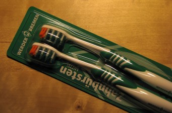 Ja, Richtig. Eine Zahnbürste für den eingefleischten Fußball-Fan. Fühlt sich da ein Fan besser, wenn er auf Borsten in der Farbgestaltung seines Lieblingsvereins beißt? Oder trägt man sie einfach nur im Stadion zu Schau in der Hosentasche?