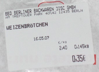 »Zwei Brötchen bitte« — zack auf die Waage, klick klick klick ... »35 ct Bitte«. Der Kilopreis beträgt 2,40 Euro.