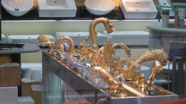 In Wan Chai gab es sehr viele Badausstatter, die Waschbecken, Toiletten und Marmorfliesen verkauften. Auch eine deutsche Firma mit dem Slogan „Pure Freude am Wasser” fanden wir. Aber auch Kitsch: