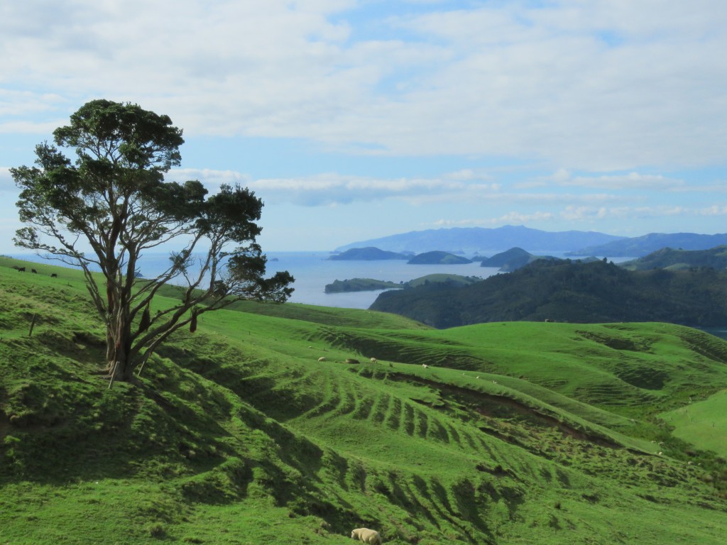 Das Gebiet südlich der Firth of Thames war sehr flach, die Straßen vom State Highways 2 waren nahezu kerzengerade. Und so blickten wir auf die Gebirgszüge der Coromandel-Halbinsel.