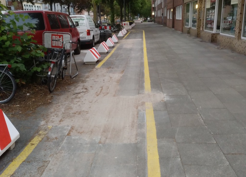 Wie war die Lage vorher? Es gab einen breiten Fußweg – auf dem Längsparken erlaubt war – und der Radweg führte genau dahin. Da allerdings fast alle neben dieser Spur querparkten, war die eigentliche Spur sogar für Radfahrende in der Regel befahrbar.