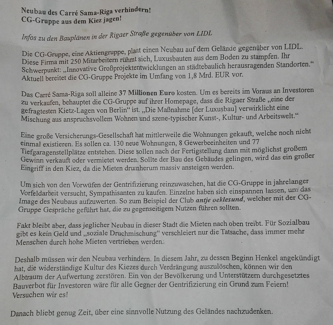 Flugzettel in der Warschauer Straße am 14.05. ca. 16:00 Uhr gefunden. Vermutlich nach der Häuserrennen-Demo. Kein Impressum. Kein ViSdP.