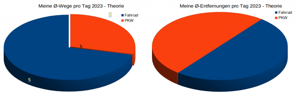 Auch hier wieder ein Beispiel von mir: ich konnte meinen Arbeitsweg inzwischen auf 2 Kilometer pro Weg verkürzen. Würde ich nach wie vor mit dem Auto fahren, ändern sich meine Verkehrsanteile nicht: 2 Wege Auto, 5 Wege Rad, 71%. Unter Berücksichtigung der Weglänge wären es schon 50% Radanteil. Allein weil 34km pro Tag entfallen.