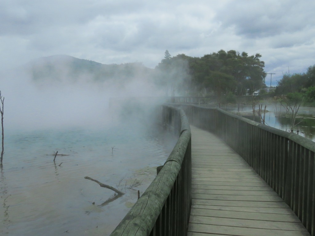 Der Kairau-Park ist ein Stadtpark in der Nähe von Ohinemutu. Besonders markant für seinen Thermalen See. Über ihn führt ein Holzsteg. Zugegebenermaßen ist sehr angenehm warm, darüber zu schlendern. Man sollte es nur nicht zu lange machen: bedingt durch die Luftfeuchtigkeit wird die Kleidung feucht. Und das ist dann blöd, wenn man den Pfad wieder verlässt. Auch beim Fotografieren muss man aufpassen, schließlich sollte die Linse nicht beschlagen.
